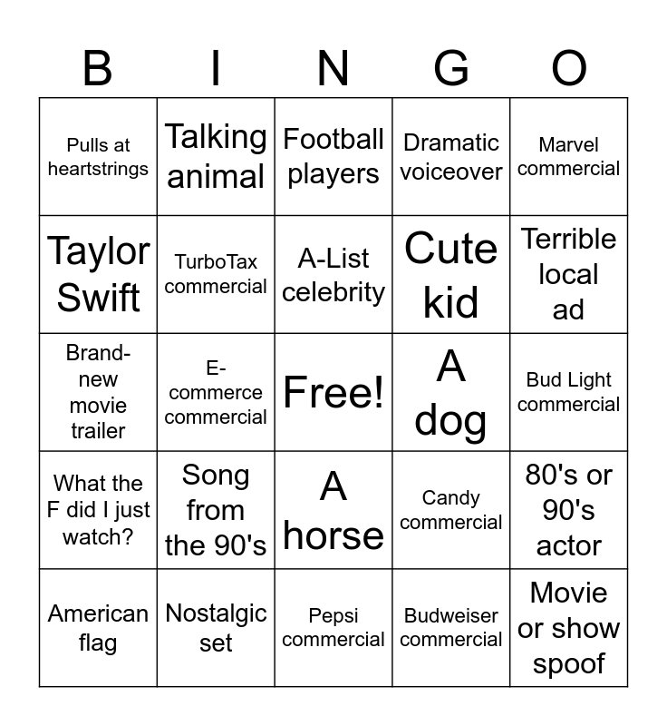 This bingo card has a free space and 24 words: Song from the 90's, Nostalgic set, A-List celebrity, American flag, Marvel commercial, Pulls at heartstrings, Taylor Swift, Talking animal, A dog, A horse, Cute kid, Brand-new movie trailer, Candy commercial, 80's or 90's actor, TurboTax commercial, Budweiser commercial, Bud Light commercial, Football players, Terrible local ad, E-commerce commercial, Movie or show spoof, What the F did I just watch?, Dramatic voiceover and Pepsi commercial.