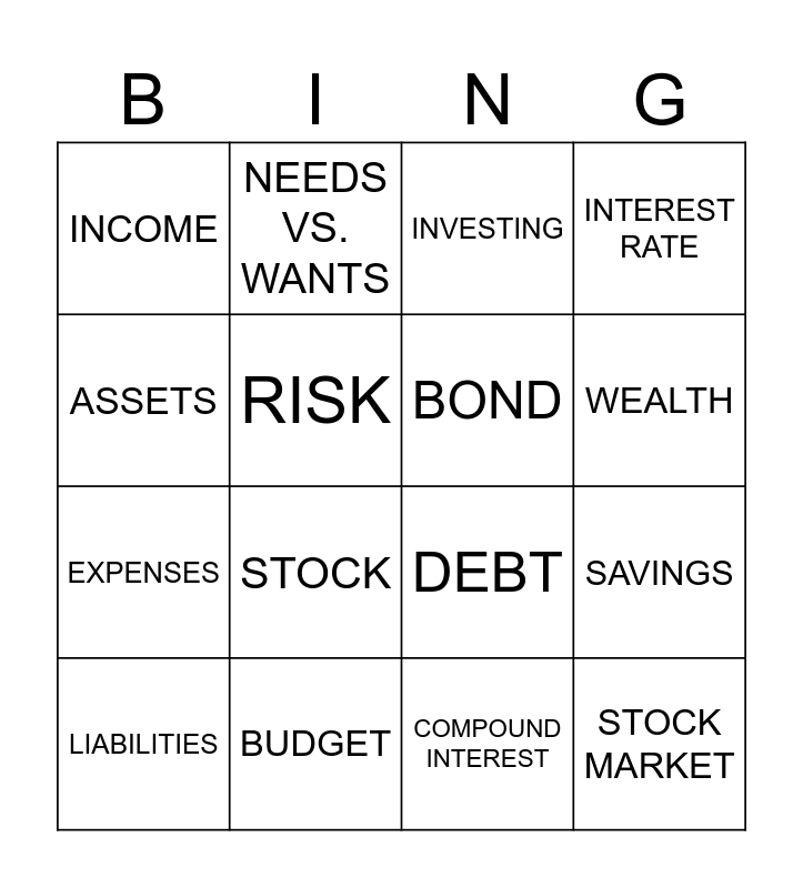 This bingo card has 16 words: BUDGET, SAVINGS, INVESTING, INCOME, EXPENSES, NEEDS VS. WANTS, DEBT, COMPOUND INTEREST, ASSETS, RISK, LIABILITIES, INTEREST RATE, STOCK, WEALTH, BOND and STOCK MARKET.