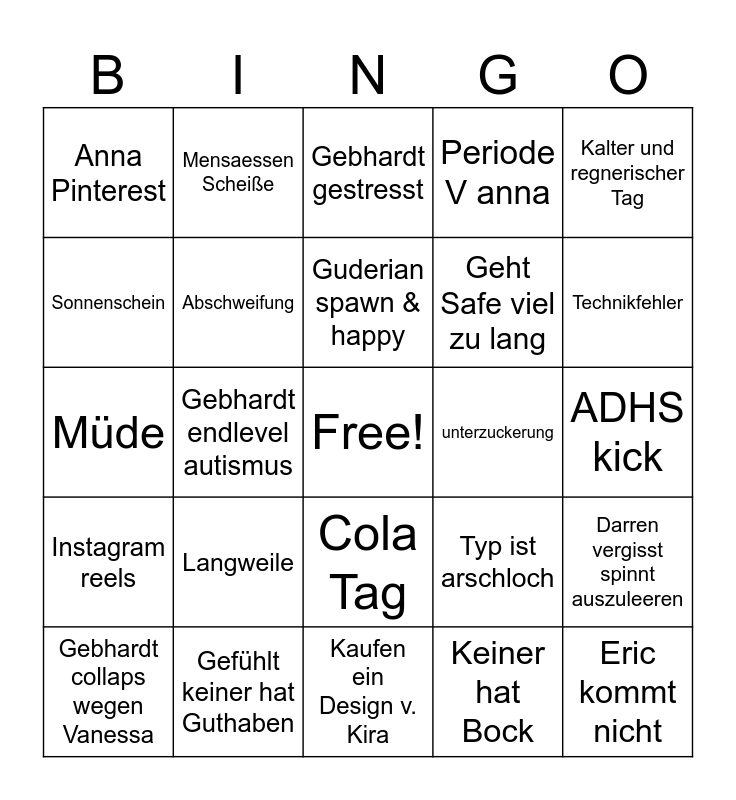 This bingo card has a free space and 24 words: Gebhardt collaps wegen Vanessa, Langweile, Guderian spawn & happy, Keiner hat Bock, Kalter und regnerischer Tag, Anna Pinterest, Mensaessen Scheiße, Gebhardt gestresst, unterzuckerung, ADHS kick, Müde, Abschweifung, Typ ist arschloch, Darren vergisst spinnt auszuleeren, Sonnenschein, Gefühlt keiner hat Guthaben, Kaufen ein Design v. Kira, Periode V anna, Technikfehler, Instagram reels, Gebhardt endlevel autismus, Cola Tag, Geht Safe viel zu lang and Eric kommt nicht.