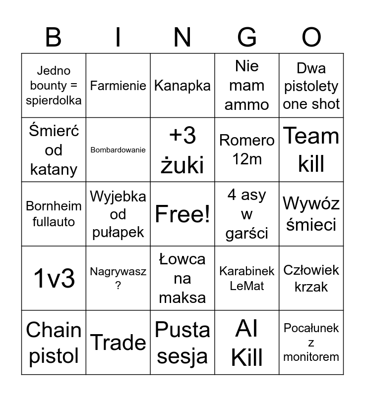 This bingo card has a free space and 24 words: Nagrywasz ?, Trade, +3 żuki, Chain pistol, Dwa pistolety one shot, Jedno bounty = spierdolka, Śmierć od katany, Farmienie, 4 asy w garści, Łowca na maksa, Romero 12m, Bornheim fullauto, Karabinek LeMat, Człowiek krzak, Bombardowanie, AI Kill, Wywóz śmieci, Kanapka, Team kill, Wyjebka od pułapek, Pocałunek z monitorem, 1v3, Nie mam ammo and Pusta sesja.