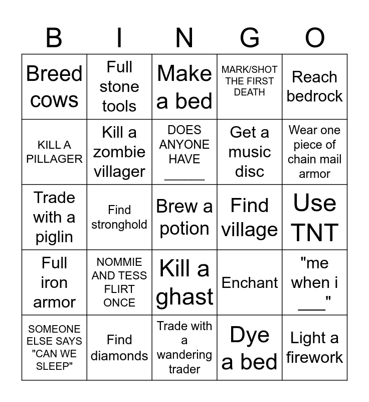 This bingo card has 30 words: Find diamonds, Get absorbsion, Find stronghold, Get a wither skeleton skull, Breed cows, Make a bed, Kill a zombie villager, Kill a ghast, Find village, Trade with a wandering trader, Use TNT, Brew a potion, Dye a bed, Light a firework, Wear one piece of chain mail armor, Make a slime block, Enchant, Full iron armor, NOMMIE AND TESS FLIRT ONCE, Reach bedrock, Trade with a piglin, Use a loom, Full stone tools, Get a music disc, KILL A PILLAGER, MARK/SHOT THE FIRST DEATH, "me when i ___", SOMEONE ELSE SAYS "CAN WE SLEEP", DOES ANYONE HAVE ______ and "WHOSE HOUSE IS THIS?".