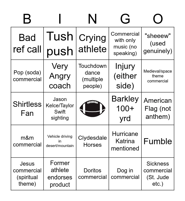 This bingo card has a free space and 29 words: Jesus commercial (spiritual theme), Doritos commercial, Jason Kelce/Taylor Swift sighting, Shirtless Fan, Bad ref call, Crying athlete, Very Angry coach, Vehicle driving in desert/mountain, Barkley 100+ yrd, Former athlete endorses product, American Flag (not anthem), Sickness commercial (St. Jude etc.), Doritos commercial, Dog in commercial, Medieval/space theme commercial, Travis Kelce Touchdown, Clydesdale Horses, m&m commercial, "sheeew" (used genuinely), Shirtless Fan, Hurricane Katrina mentioned, Mardi Gras mentioned, Injury (either side), Pop (soda) commercial, Commercial with only music (no speaking), Tush push, Fumble, Touchdown dance (multiple people) and Technology commercial.