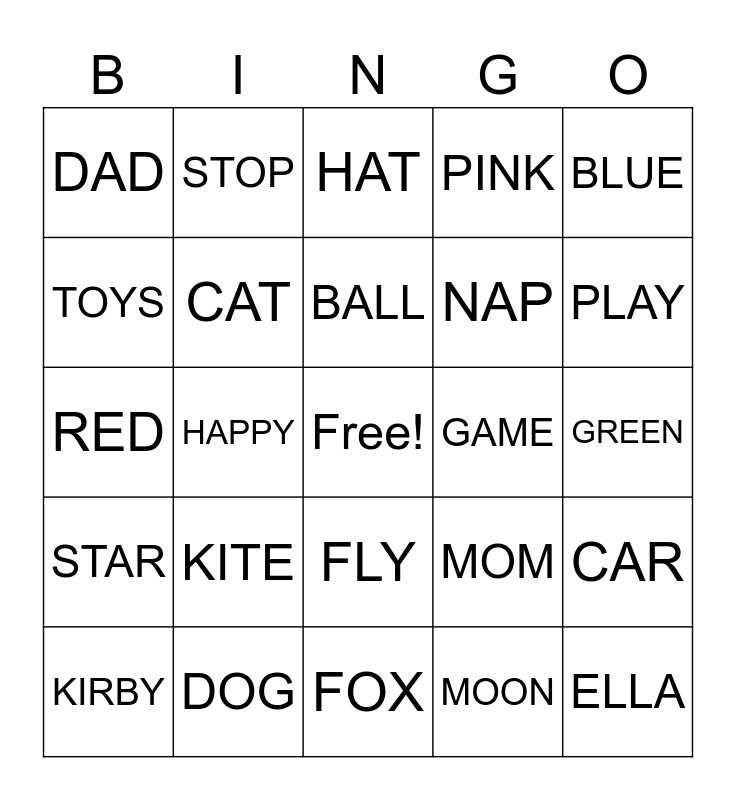 This bingo card has a free space and 24 words: KITE, DOG, BALL, KIRBY, BLUE, DAD, TOYS, STOP, GAME, FLY, NAP, RED, MOM, CAR, CAT, MOON, GREEN, HAT, PLAY, HAPPY, ELLA, STAR, PINK and FOX.