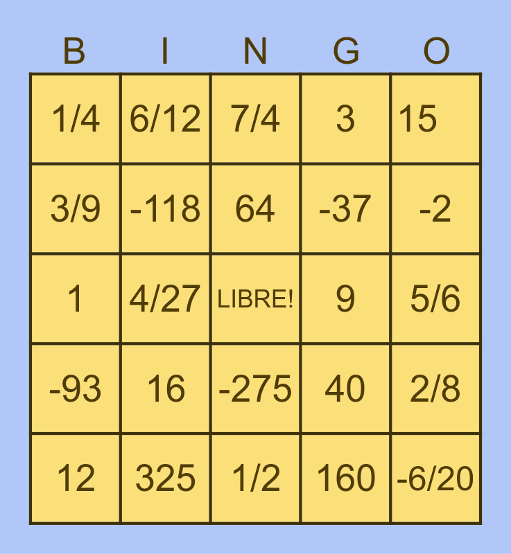 This bingo card has a free space and 24 words: 12, 16, 64, 160, 15, 1/4, 6/12, 7/4, 9, 5/6, 1, -118, 40, 2/8, 3/9, 325, 1/2, 3, -2, -93, 4/27, -275, -37 and -6/20.