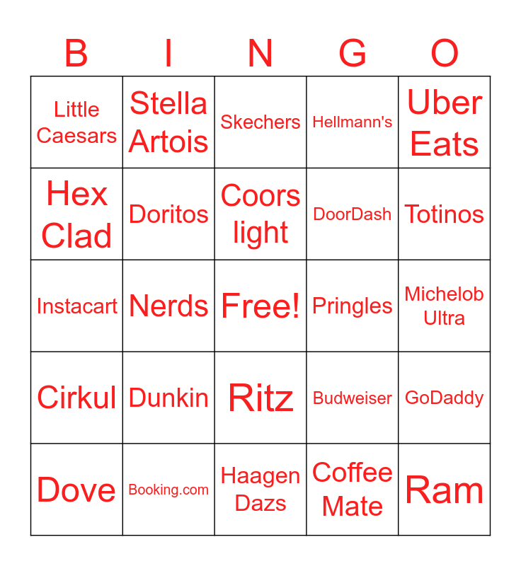 This bingo card has a free space and 24 words: Dove, Dunkin, Coors light, Coffee Mate, Uber Eats, Little Caesars, Stella Artois, Skechers, Pringles, Michelob Ultra, Instacart, Doritos, Budweiser, GoDaddy, Hex Clad, Booking.com, Haagen Dazs, Hellmann's, Totinos, Cirkul, Nerds, Ritz, DoorDash and Ram.