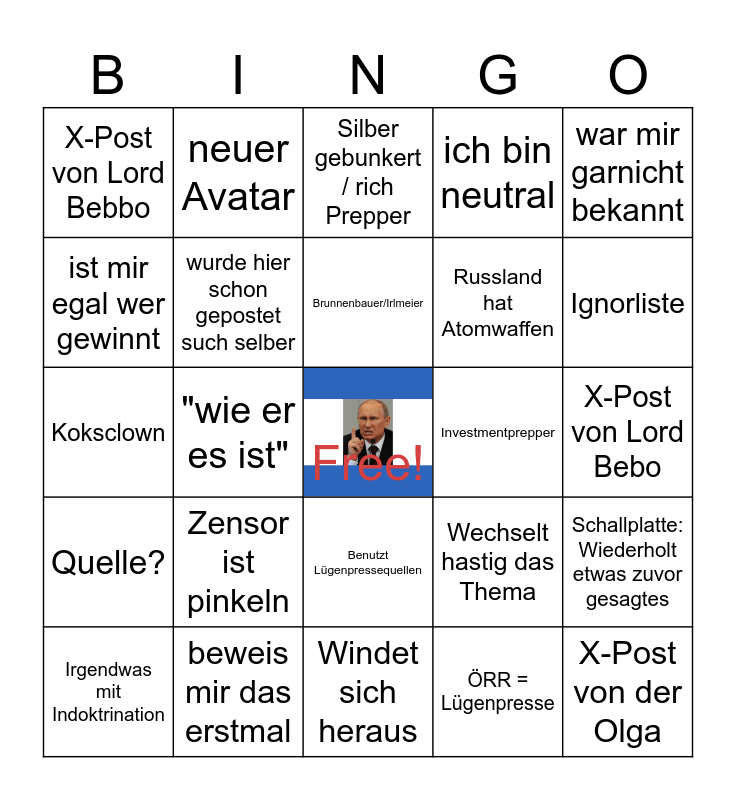 This bingo card has a free space and 61 words: Ukraine morgen dod, beweis mir das erstmal, wo habe ich das geschrieben?, Quelle?, ÖRR = Lügenpresse, ist mir egal, wurde hier schon gepostet such selber, X-Post von Zentrale Ermittlungsstelle, Russland hat Atomwaffen, dummes YT-Video/Gif/Bild ohne Kontext, ich bin neutral, +zwinkersmiley+, ist mir egal wer gewinnt, habt spass, irgendwas mit Intellekt, X-Post von Lord Bebbo, X-Post von der Olga, war mir garnicht bekannt, die Südfront!!!!!!, Brunnenbauer/Irlmeier, Investmentprepper, Silber gebunkert / rich Prepper, Irgendwas mit Indoktrination, Schallplatte: Wiederholt etwas zuvor gesagtes, Plötzlicher Themenwechsel, Ukrainenazis, Aber die USA!, Biowaffenlabore, Ignorliste, Soutfront Quelle, Ich verdiene am Krieg, Euer Weltbild, Propagandaopfer, Massenpsychose, neuer Avatar, Plenum, irgendwas mit kognitiv, "wie er es ist", Tagesschauhass, Koksclown, Hunter Biden Leaks, Zensor ist pinkeln, X-Post von Lord Bebo, Wird beim Lügen erwischt, Wechselt hastig das Thema, Prepper Sign of Approval, "Ich hatte Recht", "Habe ich schon immer gesagt", "Aber die USA/NATO/der Westen", Benutzt Lügenpressequellen, Windet sich heraus, war nur getrollt xD, Konjunktivprepper, Nuland dies das, Dyslexieprepper, Clown to clown communication, Russland kommt bis nach Aachen und Lyon, nicht von sich auf andere schließen, topp, möchte sich nicht wiederholen (und wiederholt sich dann) and merkbefreit.
