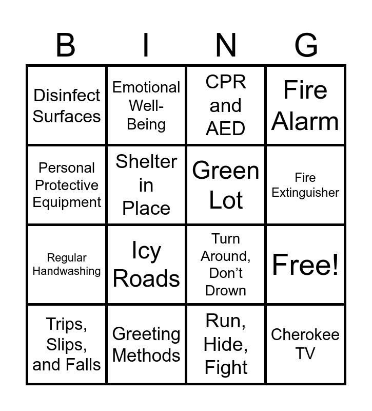 This bingo card has 20 words: Free!, Incident Report, CPR and AED, Panel of Physicians, Trips, Slips, and Falls, Personal Protective Equipment, Greeting Methods, Disinfect Surfaces, Regular Handwashing, Emotional Well-Being, Icy Roads, Turn Around, Don’t Drown, Shelter in Place, Cherokee TV, Green Lot, Practice Tee, Fire Extinguisher, Fire Alarm, Run, Hide, Fight and Exit Signs.