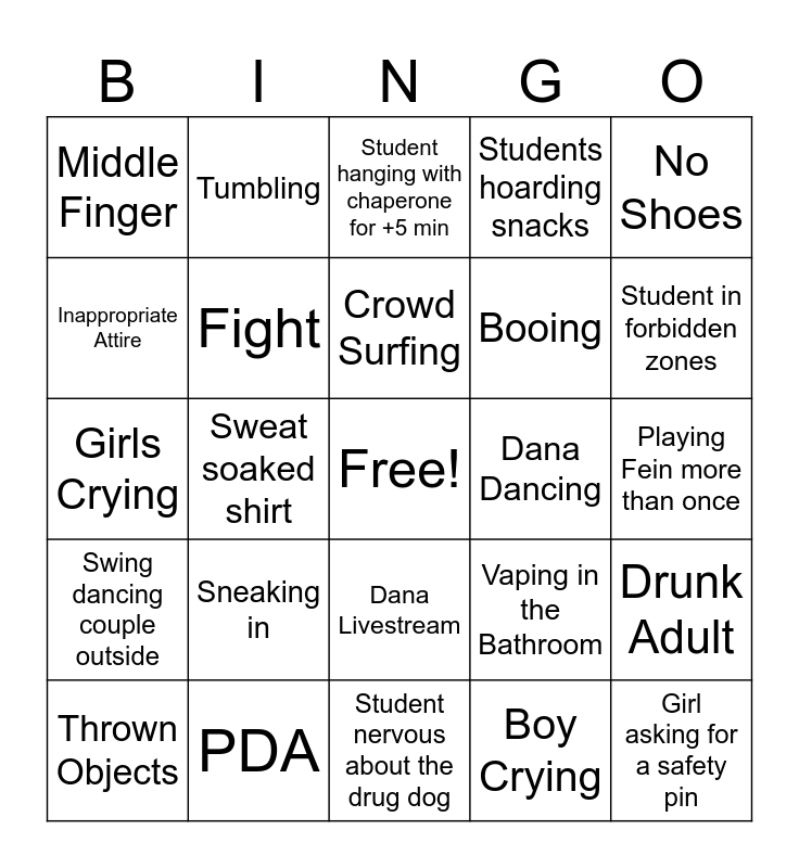 This bingo card has a free space and 24 words: Sneaking in, PDA, Crowd Surfing, Thrown Objects, No Shoes, Middle Finger, Inappropriate Attire, Tumbling, Dana Dancing, Dana Livestream, Booing, Girls Crying, Vaping in the Bathroom, Drunk Adult, Fight, Boy Crying, Playing Fein more than once, Student hanging with chaperone for +5 min, Student in forbidden zones, Sweat soaked shirt, Girl asking for a safety pin, Swing dancing couple outside, Students hoarding snacks and Student nervous about the drug dog.