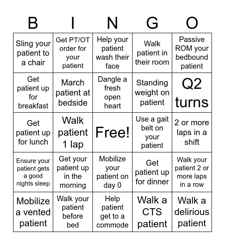 This bingo card has a free space and 24 words: Get your patient up in the morning, Walk your patient before bed, Dangle a fresh open heart, Mobilize a vented patient, Passive ROM your bedbound patient, Sling your patient to a chair, Get patient up for breakfast, Get PT/OT order for your patient, Use a gait belt on your patient, Mobilize your patient on day 0, Standing weight on patient, Get patient up for lunch, Get patient up for dinner, Walk your patient 2 or more laps in a row, March patient at bedside, Walk a CTS patient, 2 or more laps in a shift, Help your patient wash their face, Q2 turns, Walk patient 1 lap, Walk a delirious patient, Ensure your patient gets a good nights sleep, Walk patient in their room and Help patient get to a commode.