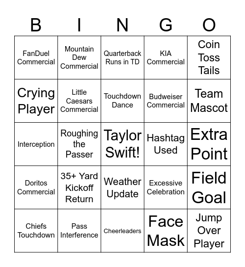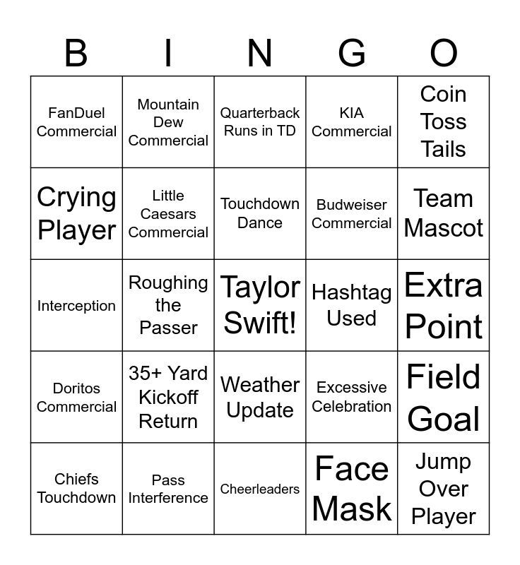 This bingo card has a free space and 80 words: Non-Taylor Swift Celebrity, Booking.com Commercial, Quarterback Runs in TD, Roughing the Passer, Coors Light Commercial, Foam Finger, 0-0 at 0:00, Fumble, Dove Commercial, Defensive Touchdown, Hellmann's Commercial, Kick Off Return Touchdown, KIA Commercial, FanDuel Commercial, Eagles Touchdown, Crying Player, Jump Over Player, 35+ Yard Kickoff Return, Eagles Touchdown, Extra Point, Chiefs Field Goal, Coin Toss Tails, Interception, Touchdown Dance, Little Caesars Commercial, Receiving Touchdown, Punt Return Touchdown, Play Reviewed, Wide Receiver Touchdown, Diving Catch, Team Mascot, Team Owner, Cheerleaders, Hawk Tuah, Chiefs Touchdown, Hashtag Used, Instant Replay, Touchdown Dance, Drunk Fan, Jump Over Player, Coin Toss Heads, Eagles Field Goal, Frito Lay Commercial, TurboTax Commercial, Overhead Shot of the Stadium, Mountain Dew Commercial, Jeep Commercial, Oreo Commercial, Quarterback Sack, Gatorade Shower, Field Goal, Roughing the Passer, Excessive Celebration, Two-Point Conversion, Horse Collar Tackle, Offensive Timeout, Blocked Kick, Reese's Commercial, Coach Screaming, Weather Update, Budweiser Commercial, Offside, 25+ Yard Run, Tight End Touchdown, Fan with Face Paint, Rocket Mortgage Commercial, Nerds Commercial, Onside Kick, One-Handed Catch, Running Back Touchdown, Doritos Commercial, Pass Interference, Trick Play, Referee Huddle, Crypto Commercial, WeatherTech Commercial, Face Mask, Eagles Up by 10+, Sketchers Commercial and Chiefs Up by 10+.