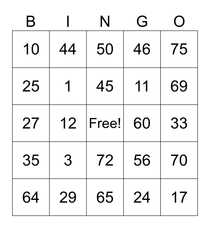 This bingo card has a free space and 24 words: 3, 29, 45, 64, 75, 10, 25, 44, 60, 72, 11, 27, 56, 70, 1, 24, 33, 50, 69, 12, 17, 35, 46 and 65.