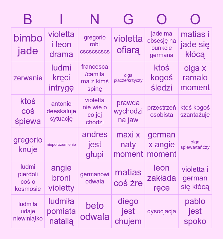 This bingo card has 36 words: matias coś żre, germanowi odwala, diego jest chujem, zerwanie, gregorio knuje, prawda wychodzi na jaw, ludmi kręci intrygę, beto odwala, jade ma obsesję na punkcie germana, leon zakłada ręce, olga x ramalo moment, violetta ofiarą, violetta i german się kłócą, antonio deeskaluje sytuację, olga płacze/krzyczy, bimbo jade, ludmi pierdoli coś o kosmosie, przestrzeń osobista, ktoś coś śpiewa, gregorio robi cscscscscs, violetta nie wie o co jej chodzi, nieporozumienie, maxi x naty moment, andres jest głupi, german x angie moment, violetta i leon drama, ktoś kogoś śledzi, ludmiła pomiata natalią, francesca /camila ma z kimś spinę, matias i jade się kłócą, pablo jest spoko, ludmiła udaje niewiniątko, olga śpiewa/tańćzy, ktoś kogoś szantażuje, angie broni violetty and dysocjacja.