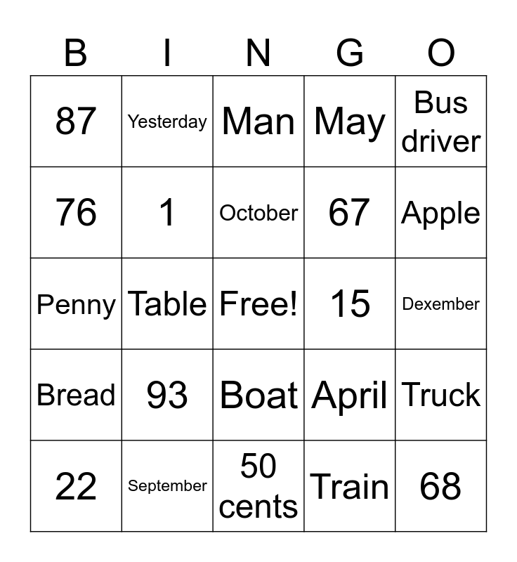 This bingo card has a free space and 84 words: Goodbye, Woman, Man, Girl, Boy, Mother, Father, Son, Daughter, Sister, Brother, Baby, 1, 15, 56, 87, 22, 76, 23, 45, 57, 67, 68, 78, Table, Chair, Pen, Book, Hello, 81, 93, 100, 1000, Penny, $20, $100, 50 cents, Biscuit, Apple, Bread, Banana, Cookie, Chicken, Beef, Pasta, Computer, Yesterday, Tomorrow, Today, January, February, April, May, June, July, August, September, October, November, Dexember, First, Second, Third, How are you, Doctor, Dentist, Teacher, Taxi driver, Bus driver, Car, Truck, Bus, Taxi, Airplane, Boat, Train, Bicycle, Shirt, Pants, Skirt, Dress, Socks, Shoes and Blouse.