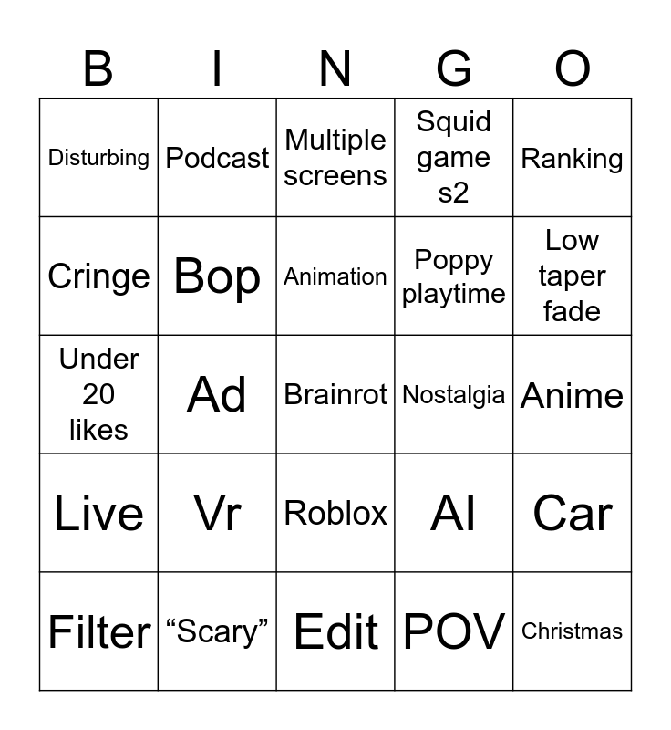 This bingo card has a free space and 24 words: Filter, Vr, Animation, POV, Ranking, Disturbing, Podcast, Multiple screens, Nostalgia, Anime, Under 20 likes, Bop, AI, Car, Cringe, “Scary”, Edit, Squid game s2, Low taper fade, Live, Ad, Roblox, Poppy playtime and Christmas.