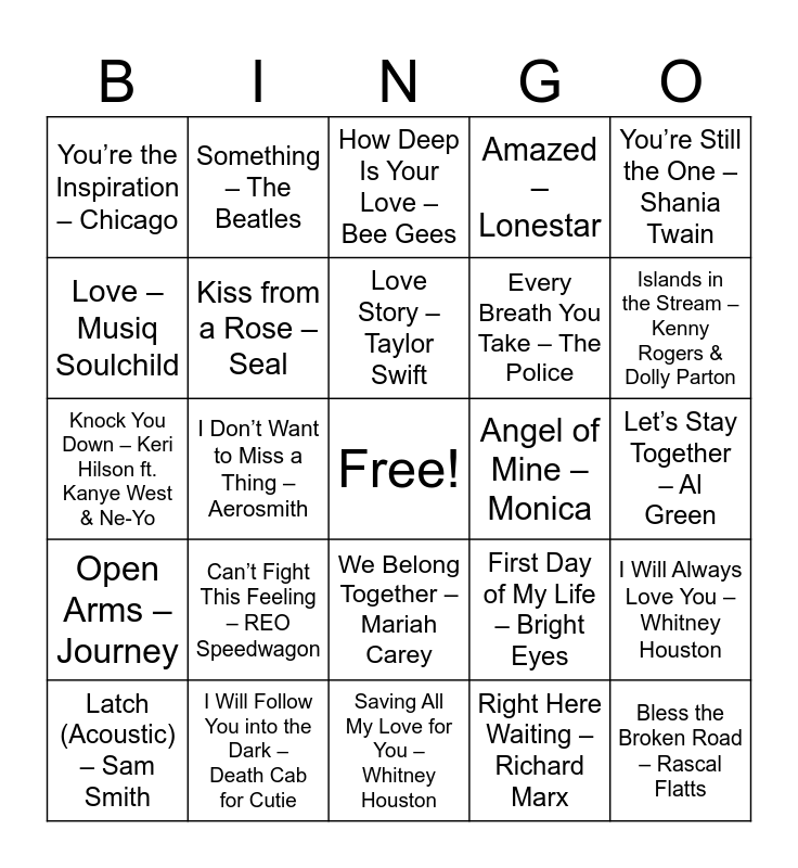 This bingo card has a free space and 66 words: Unchained Melody – The Righteous Brothers, Can’t Help Falling in Love – Elvis Presley, At Last – Etta James, I Will Always Love You – Whitney Houston, My Heart Will Go On – Celine Dion, When a Man Loves a Woman – Percy Sledge, Something – The Beatles, Your Song – Elton John, Love Story – Taylor Swift, Because You Loved Me – Celine Dion, We Belong Together – Mariah Carey, If I Ain’t Got You – Alicia Keys, Let’s Stay Together – Al Green, You’re Still the One – Shania Twain, Spend My Life with You – Eric Benét & Tamia, Love – Musiq Soulchild, I Don’t Want to Miss a Thing – Aerosmith, You’re the Inspiration – Chicago, Nothing Else Matters – Metallica, Every Breath You Take – The Police, Can’t Fight This Feeling – REO Speedwagon, Open Arms – Journey, Amazed – Lonestar, I Cross My Heart – George Strait, Breathe – Faith Hill, It’s Your Love – Tim McGraw & Faith Hill, Tennessee Whiskey – Chris Stapleton, You Had Me from Hello – Kenny Chesney, Bless the Broken Road – Rascal Flatts, Meant to Be – Bebe Rexha & Florida Georgia Line, Latch (Acoustic) – Sam Smith, Bloom – The Paper Kites, Home – Edward Sharpe & The Magnetic Zeros, Sweet Disposition – The Temper Trap, First Day of My Life – Bright Eyes, I Will Follow You into the Dark – Death Cab for Cutie, Best I Ever Had – Drake, Knock You Down – Keri Hilson ft. Kanye West & Ne-Yo, Right Here Waiting – Richard Marx, Time After Time – Cyndi Lauper, Kiss from a Rose – Seal, I’ll Make Love to You – Boyz II Men, Angel of Mine – Monica, I Swear – All-4-One, Truly Madly Deeply – Savage Garden, As Long As You Love Me – Backstreet Boys, Islands in the Stream – Kenny Rogers & Dolly Parton, Endless Love – Lionel Richie & Diana Ross, A Whole New World – Peabo Bryson & Regina Belle, Nobody Wants to Be Lonely – Ricky Martin & Christina Aguilera, Lucky – Jason Mraz & Colbie Caillat, Rewrite the Stars – Zac Efron & Zendaya, Like I’m Gonna Lose You – Meghan Trainor & John Legend, Beauty and the Beast – Celine Dion & Peabo Bryson, Beneath Your Beautiful – Labrinth & Emeli Sandé, When You Say Nothing at All – Alison Krauss & Union Station, I Just Called to Say I Love You – Stevie Wonder, (Everything I Do) I Do It for You – Bryan Adams, How Deep Is Your Love – Bee Gees, Saving All My Love for You – Whitney Houston, To Love Somebody – Bee Gees, You’re My Best Friend – Queen, Un-break My Heart – Toni Braxton, Have I Told You Lately – Rod Stewart, I Want to Know What Love Is – Foreigner and Love Song - The Cure.