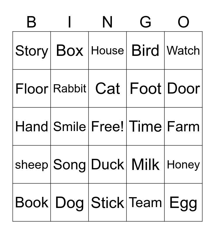 This bingo card has a free space and 24 words: Song, Dog, Cat, Book, Watch, Story, Floor, Box, Time, Duck, Foot, Hand, Milk, Honey, Rabbit, Team, Farm, House, Door, Smile, Egg, sheep, Bird and Stick.