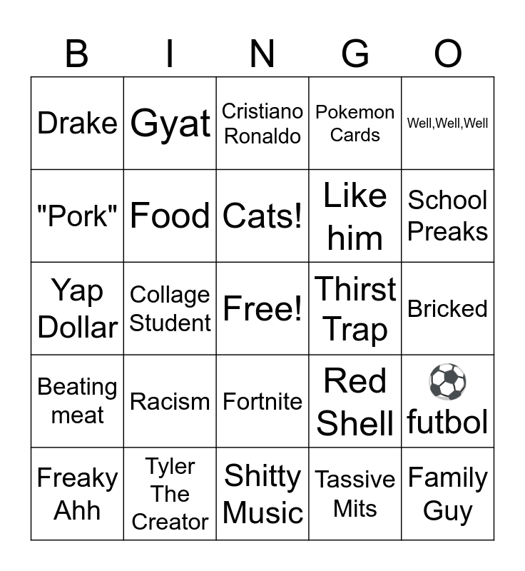 This bingo card has a free space and 24 words: Racism, Tyler The Creator, Cats!, Freaky Ahh, Well,Well,Well, Drake, "Pork", Gyat, Thirst Trap, Fortnite, Like him, Yap Dollar, Red Shell, ⚽ futbol, Food, Tassive Mits, Bricked, Cristiano Ronaldo, School Preaks, Collage Student, Family Guy, Beating meat, Pokemon Cards and Shitty Music.