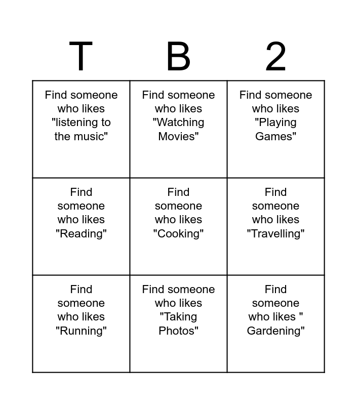 This bingo card has a free space and 8 words: Find someone who likes "Travelling", Find someone who likes "Playing Games", Find someone who likes "Watching Movies", Find someone who likes "Running", Find someone who likes "listening to the music", Find someone who likes " Gardening", Find someone who likes "Reading" and Find someone who likes "Taking Photos".