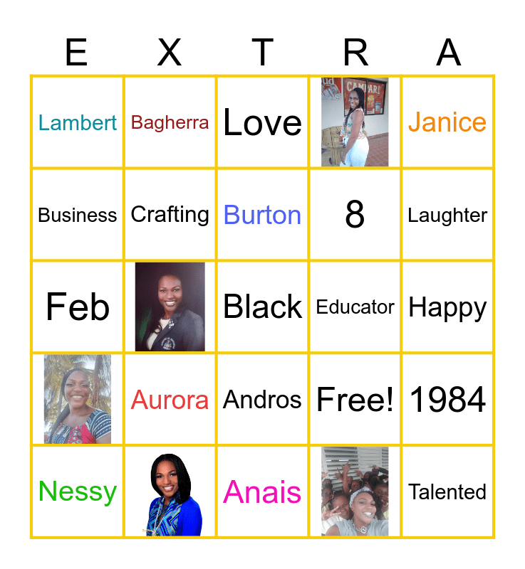 This bingo card has 5 images and 20 words: Aurora, Anais, Burton, Nessy, Janice, Lambert, Business, Bagherra, Educator, Andros, 8, Feb, Free!, 1984, Crafting, Talented, Happy, Love, Laughter and Black.