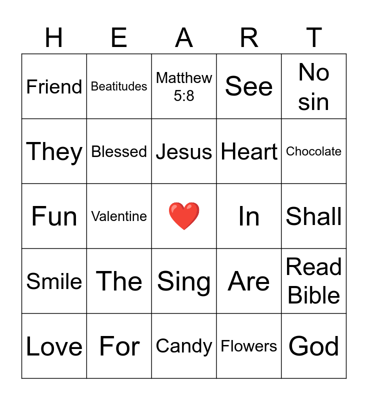 This bingo card has a free space and 29 words: Love, February 14, Valentine, Happy, Friend, Matthew 5:8, Blessed, The, In, For, Shall, God, Candy, Flowers, Chocolate, Hug, Sing, Smile, No sin, Fun, Are, Pure, Heart, They, See, Beatitudes, Read Bible, Jesus and Pray.