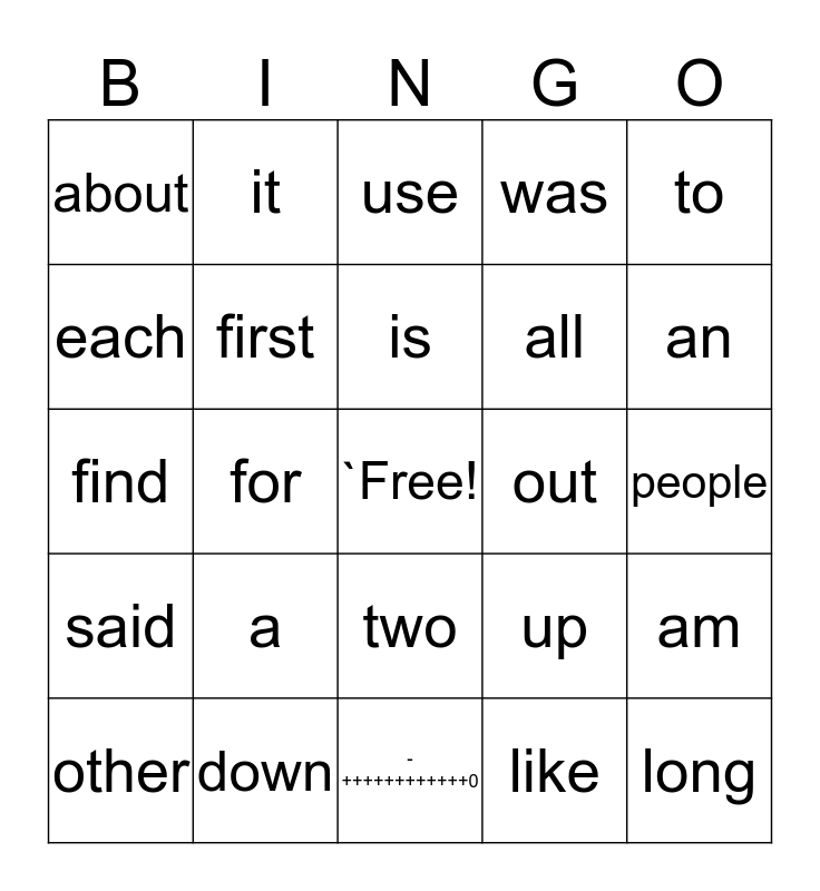 This bingo card has a free space and 24 words: a, down, is, other, to, about, each, it, out, two, all, find, up, am, first, like, people, use, an, for, long, said, was and -++++++++++++0.