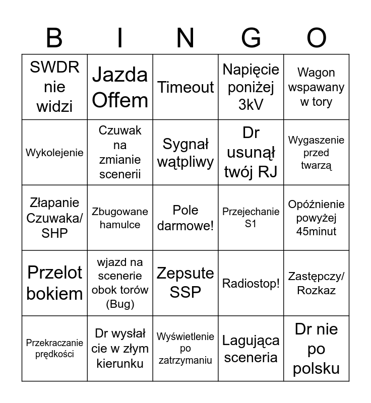 This bingo card has a free space and 24 words: wjazd na scenerie obok torów (Bug), Dr wysłał cie w złym kierunku, Sygnał wątpliwy, Przekraczanie prędkości, Wagon wspawany w tory, SWDR nie widzi, Wykolejenie, Jazda Offem, Przejechanie S1, Zepsute SSP, Dr usunął twój RJ, Złapanie Czuwaka/ SHP, Radiostop!, Zastępczy/ Rozkaz, Czuwak na zmianie scenerii, Lagująca sceneria, Opóźnienie powyżej 45minut, Timeout, Wygaszenie przed twarzą, Zbugowane hamulce, Dr nie po polsku, Przelot bokiem, Napięcie poniżej 3kV and Wyświetlenie po zatrzymaniu.