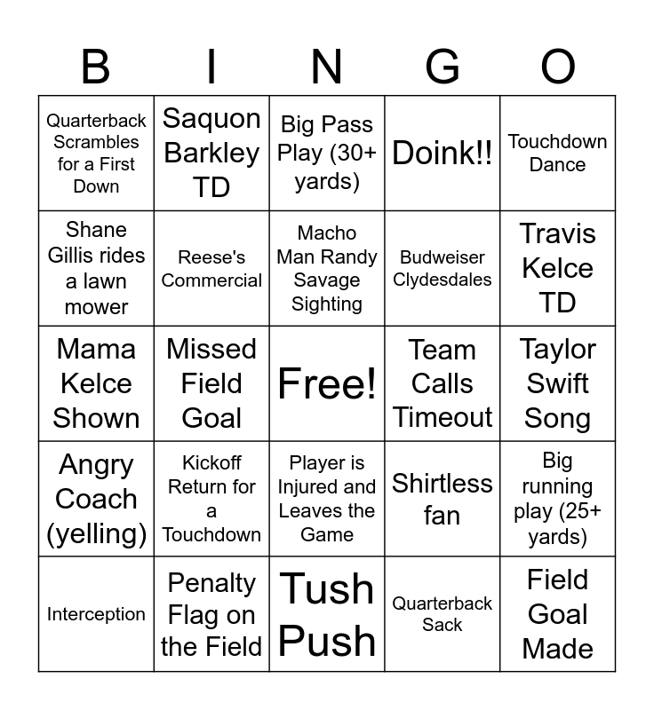 This bingo card has a free space and 45 words: Touchdown Scored, Field Goal Made, Fumble Turnover, Interception, Challenge Flag Thrown, Quarterback Sack, Big Pass Play (30+ yards), Successful 2-point Conversion, Touchdown Dance, Penalty Flag on the Field, Doink!!, Team Calls Timeout, Player is Injured and Leaves the Game, Kickoff Return for a Touchdown, Defensive Stop on 4th Down, Tush Push, Safety (2 points), Mama Kelce Shown, Coaching Challenge Lost, Travis Kelce TD, Saquon Barkley TD, Mahomes Rushing TD, Special Teams Play (like a blocked punt or kick), Quarterback Scrambles for a First Down, Hurts Rushing TD, Taylor Swift Song, Peyton and Eli, Monday's Light, Shirtless fan, Angry Coach (yelling), Mahomes injury, Big running play (25+ yards), Referee falls down, Kissing, Hurts Injury, Missed Field Goal, Unannounced half-time guest (not Kendrick or Sza), Disney film commercial, Dancing Tongue Commercial, Macho Man Randy Savage Sighting, Shane Gillis rides a lawn mower, Budweiser Clydesdales, Adam Brody blows(into) a pringles can, Reese's Commercial and Taylor Swift Shown.