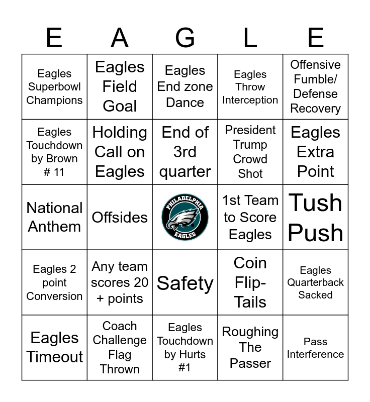 This bingo card has a free space and 27 words: Coin Flip- Tails, Eagles Halftime Lead, President Trump Crowd Shot, Eagles Touchdown by Hurts #1, Eagles Touchdown by Brown # 11, Eagles End zone Dance, Eagles Field Goal, Eagles 2 point Conversion, 1st Team to Score Eagles, Eagles Quarterback Sacked, National Anthem, Eagles Throw Interception, Eagles Timeout, Coach Challenge Flag Thrown, Eagles Extra Point, Game tied after 1st quarter, Holding Call on Eagles, End of 3rd quarter, Any team scores 20 + points, Eagles Superbowl Champions, Tush Push, Roughing The Passer, Offsides, Pass Interference, Safety, Offensive Fumble/ Defense Recovery and Touchdown Over 40yds.