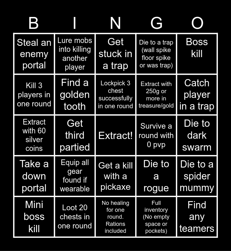 This bingo card has a free space and 24 words: Equip all gear found if wearable, Loot 20 chests in one round, Lockpick 3 chest successfully in one round, Mini boss kill, Boss kill, Steal an enemy portal, Kill 3 players in one round, Lure mobs into killing another player, Survive a round with 0 pvp, Get a kill with a pickaxe, Extract with 250g or more in treasure/gold, Extract with 60 silver coins, Die to a rogue, Die to a spider mummy, Find a golden tooth, Full inventory (No empty space or pockets), Die to dark swarm, Get stuck in a trap, Catch player in a trap, Get third partied, Find any teamers, Take a down portal, Die to a trap (wall spike floor spike or was trap) and No healing for one round. Rations included.