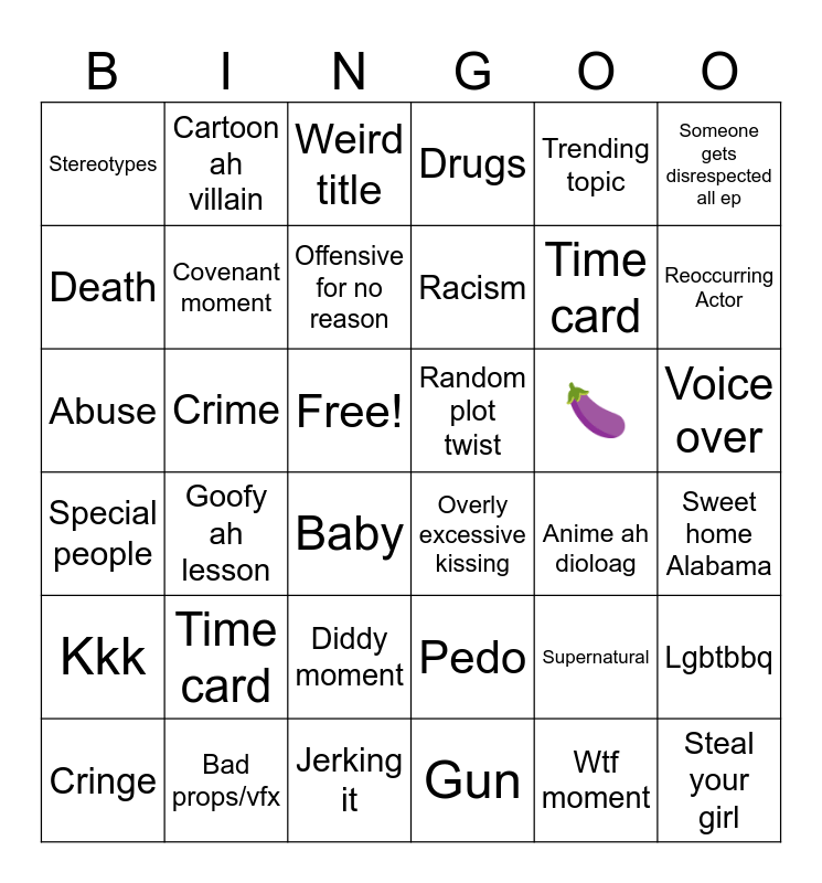 This bingo card has 36 words: Pedo, Diddy moment, Gun, Death, Special people, Random plot twist, Covenant moment, Jerking it, Trending topic, Supernatural, Reoccurring Actor, Drugs, Lgbtbbq, Crime, Racism, Stereotypes, Kkk, 🍆, Abuse, Weird title, Free!, Goofy ah lesson, Overly excessive kissing, Baby, Anime ah dioloag, Cartoon ah villain, Time card, Bad props/vfx, Offensive for no reason, Someone gets disrespected all ep, Steal your girl, Cringe, Sweet home Alabama, Voice over, Time card and Wtf moment.