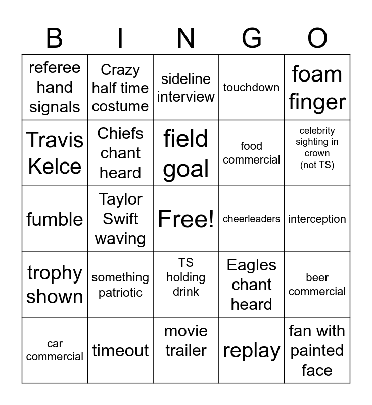 This bingo card has a free space and 24 words: something patriotic, timeout, field goal, car commercial, foam finger, referee hand signals, Travis Kelce, Crazy half time costume, cheerleaders, TS holding drink, food commercial, fumble, Eagles chant heard, beer commercial, Chiefs chant heard, replay, interception, sideline interview, celebrity sighting in crown (not TS), Taylor Swift waving, fan with painted face, trophy shown, touchdown and movie trailer.