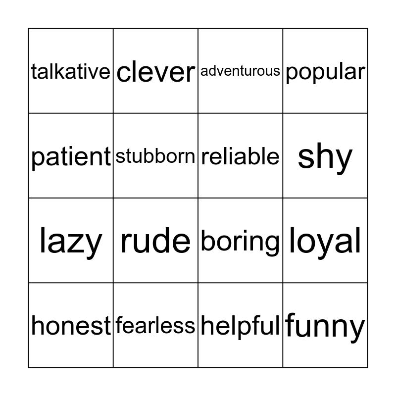 This bingo card has a free space and 15 words: honest, funny, adventurous, talkative, shy, patient, rude, helpful, stubborn, lazy, loyal, popular, reliable, clever and fearless.