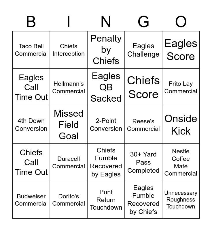 This bingo card has 38 words: Uber Eats Commercial, Pringles Commercial, Dunkin' Commercial, Hellmann's Commercial, Nestle Coffee Mate Commercial, Duracell Commercial, Eagles QB Sacked, Chiefs QB Sacked, Eagles Score, Chiefs Score, Missed Field Goal, Eagles Challenge, 2-Point Conversion, Onside Kick, Eagles Call Time Out, Chiefs Call Time Out, Penalty by Eagles, Penalty by Chiefs, Taylor is Shown on Camera, Reese's Commercial, Taco Bell Commercial, Dorito's Commercial, Frito Lay Commercial, Budweiser Commercial, Blocked Kick, Punt Return Touchdown, Unnecessary Roughness Touchdown, Touchdown Dance, Roughing the Passer Penalty, Face Mask Penalty, Chiefs Challenge, Chiefs Fumble Recovered by Eagles, Eagles Fumble Recovered by Chiefs, Chiefs Interception, Eagles Interception, 30+ Yard Pass Completed, 4th Down Conversion and Missed Extra Point.
