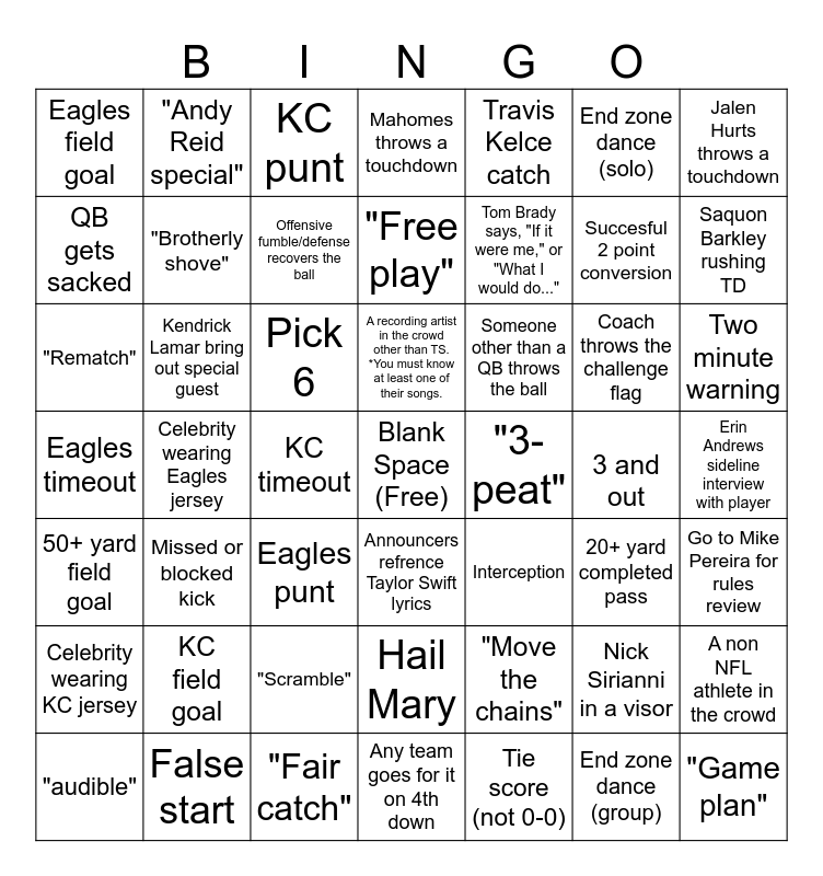 This bingo card has a free space and 48 words: "Move the chains", Succesful 2 point conversion, Any team goes for it on 4th down, Celebrity wearing Eagles jersey, Pick 6, Erin Andrews sideline interview with player, "Andy Reid special", False start, End zone dance (solo), Announcers refrence Taylor Swift lyrics, Jalen Hurts throws a touchdown, Mahomes throws a touchdown, Coach throws the challenge flag, Someone other than a QB throws the ball, Celebrity wearing KC jersey, 3 and out, QB gets sacked, Saquon Barkley rushing TD, Nick Sirianni in a visor, Travis Kelce catch, Tom Brady says, "If it were me," or "What I would do...", KC timeout, Eagles field goal, "Brotherly shove", A non NFL athlete in the crowd, Offensive fumble/defense recovers the ball, Two minute warning, "audible", A recording artist in the crowd other than TS. *You must know at least one of their songs., Kendrick Lamar bring out special guest, End zone dance (group), "3-peat", Go to Mike Pereira for rules review, KC field goal, Eagles timeout, Interception, 20+ yard completed pass, "Rematch", Eagles punt, "Scramble", 50+ yard field goal, "Game plan", KC punt, "Fair catch", "Free play", Hail Mary, Missed or blocked kick and Tie score (not 0-0).