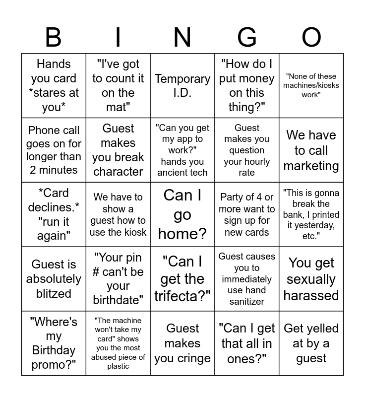 This bingo card has a free space and 24 words: "Your pin # can't be your birthdate", "The machine won't take my card" shows you the most abused piece of plastic, "Can you get my app to work?" hands you ancient tech, "Where's my Birthday promo?", "None of these machines/kiosks work", Hands you card *stares at you*, Phone call goes on for longer than 2 minutes, "I've got to count it on the mat", Party of 4 or more want to sign up for new cards, "Can I get the trifecta?", Guest makes you question your hourly rate, *Card declines.* "run it again", Guest causes you to immediately use hand sanitizer, You get sexually harassed, Guest makes you break character, "Can I get that all in ones?", "This is gonna break the bank, I printed it yesterday, etc.", Temporary I.D., We have to call marketing, We have to show a guest how to use the kiosk, Get yelled at by a guest, Guest is absolutely blitzed, "How do I put money on this thing?" and Guest makes you cringe.