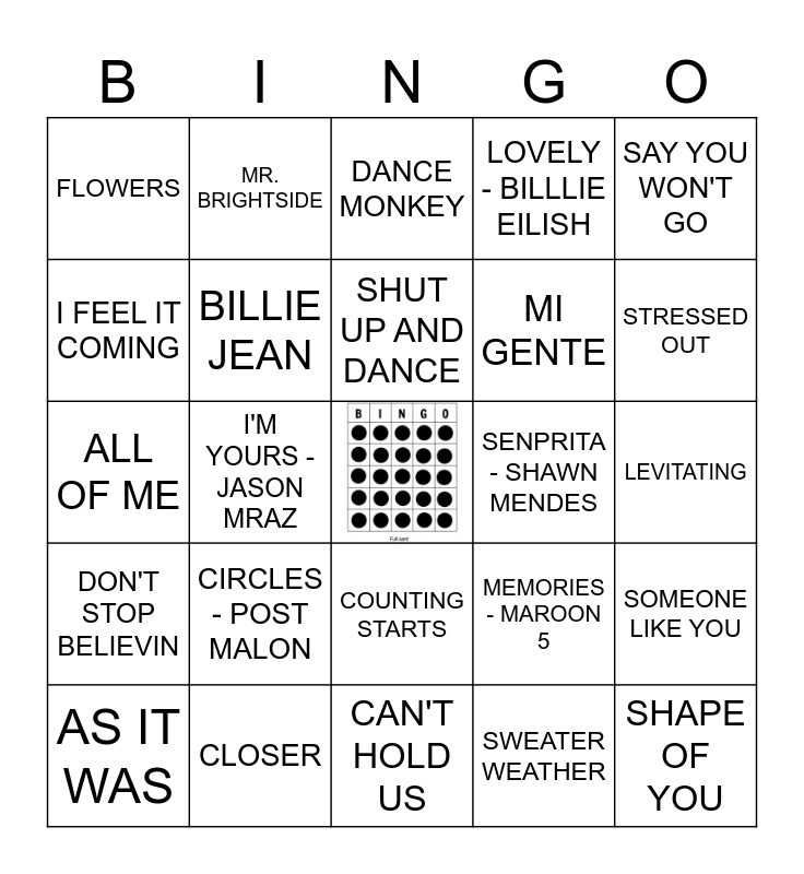 This bingo card has a free space and 45 words: BLINDING LIGHTS, SHAPE OF YOU, SOMEONE YOU LOVED, AS IT WAS, SUNFLOWER, SWEATER WEATHER, DANCE MONKEY, BELIEVER, SAY YOU WON'T GO, CLOSER, LOVELY - BILLLIE EILISH, SENPRITA - SHAWN MENDES, COUNTING STARTS, CIRCLES - POST MALON, BOHEMIAN RHAPSODY, CAN'T HOLD US, YELLOW, ALL OF ME, WAKE ME UP, STRESSED OUT, MR. BRIGHTSIDE, WHEN I WAS YOUR MAN, HAPPIER, FLOWERS, LEAN ON - MAJOR LAZER, LEVITATING, TOO GOOD AT GOODBYES, SMELL LIKE TEEN SPIRIT, MEMORIES - MAROON 5, DON'T STOP BELIEVIN, TAKE ON ME, SOMEONE LIKE YOU, BEFORE YOU GO, ALL I WANT FOR CHRISTMAS, PUMPED UP KICKS, I'M YOURS - JASON MRAZ, CHEAP THRILLS, CAN'T STOP THE FEELING!, CHEERLEADER, SHUT UP AND DANCE, I FEEL IT COMING, MI GENTE, WORK FORM HOME, BILLIE JEAN and HOTLINE BLING.