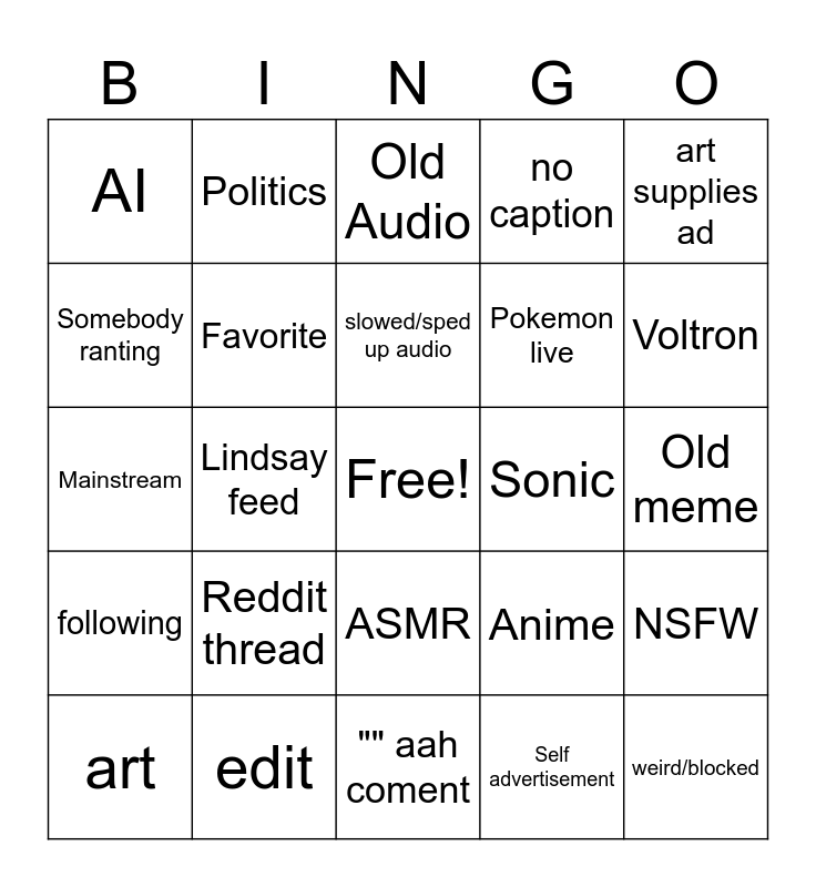 This bingo card has a free space and 24 words: Reddit thread, edit, slowed/sped up audio, art, art supplies ad, AI, Somebody ranting, Politics, Sonic, ASMR, Pokemon live, Mainstream, Anime, NSFW, Favorite, Self advertisement, Old meme, Old Audio, Voltron, Lindsay feed, weird/blocked, following, no caption and "" aah coment.