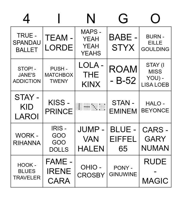 This bingo card has a free space and 41 words: HELP! - THE BEATLES, STAY - KID LAROI, P.I.M.P. - 50 CENT, PUSH - MATCHBOX TWENY, FAME - IRENE CARA, JUMP - VAN HALEN, LOLA - THE KINX, NUMB - LINKIN PARK, BURN - EILLE GOULDING, WORK - RIHANNA, KISS - PRINCE, BABE - STYX, RUDE - MAGIC, HALO - BEYONCE, STAN - EMINEM, IRIS - GOO GOO DOLLS, HOLY - JUSTIN BIEBER, TRUE - SPANDAU BALLET, EASY - COMMODORES, MAPS - YEAH YEAH YEAHS, CARS - GARY NUMAN, SING - ED SHEERAN, OHIO - CROSBY, ROAM - B-52, LUKA - SUZANNE VEGA, EPIC - FAITH NO MOE, PONY - GINUWINE, TORN - NATALIE IMBRUGLIA, STAY (I MISS YOU) - LISA LOEB, LEGS - ZZ TOP, SARA - STARSHIP, TEAM - LORDE, HOOK - BLUES TRAVELER, HOME - PHILLIP PHILLIPS, BLUE - EIFFEL 65, STOP! - JANE'S ADDICTION, CUPS - ANNA KENDRICK, HURT - CHRISTINA AGUILERA, GONE - NSYNCE, ADIA - SARAH MCLACHLAN and YEAH! - USHER.
