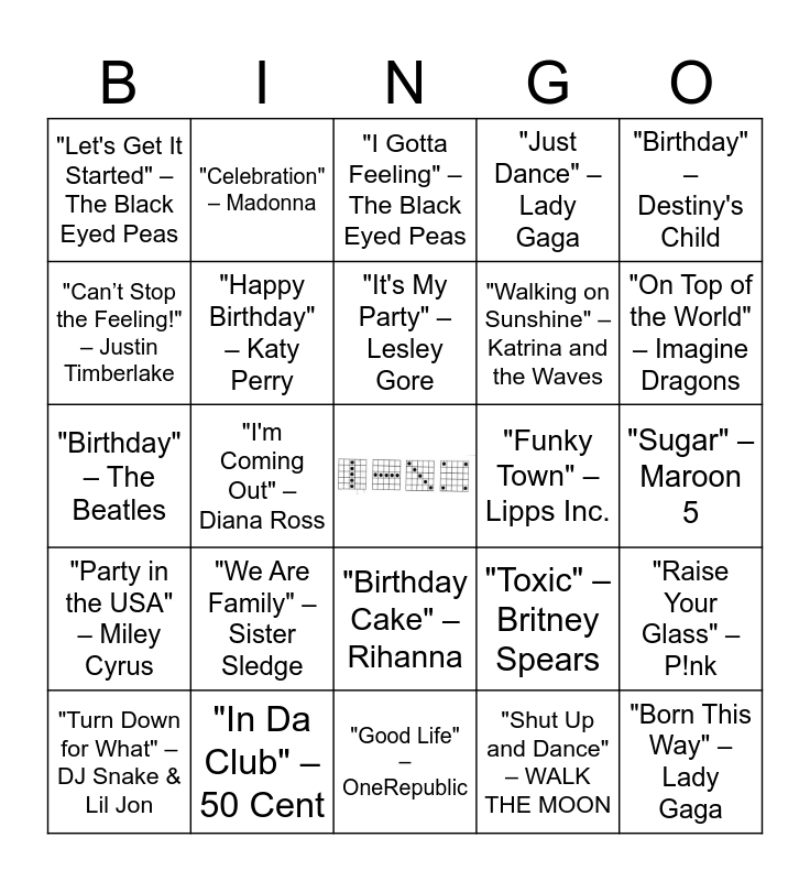 This bingo card has a free space and 40 words: "Happy Birthday" – Stevie Wonder, "Birthday" – The Beatles, "Celebration" – Kool & The Gang, "Happy Birthday" – Katy Perry, "In Da Club" – 50 Cent, "Birthday Cake" – Rihanna, "It's My Party" – Lesley Gore, "The Best Day of My Life" – American Authors, "Birthday" – Destiny's Child, "Party in the USA" – Miley Cyrus, "I'm Coming Out" – Diana Ross, "Just Dance" – Lady Gaga, "Born This Way" – Lady Gaga, "Sugar" – Maroon 5, "Funky Town" – Lipps Inc., "We Are Family" – Sister Sledge, "Good Time" – Owl City & Carly Rae Jepsen, "Let's Get It Started" – The Black Eyed Peas, "All I Do Is Win" – DJ Khaled, "I Gotta Feeling" – The Black Eyed Peas, "Raise Your Glass" – P!nk, "Shut Up and Dance" – WALK THE MOON, "Walking on Sunshine" – Katrina and the Waves, "Can’t Stop the Feeling!" – Justin Timberlake, "Dancing Queen" – ABBA, "Viva La Vida" – Coldplay, "Happy" – Pharrell Williams, "Let’s Celebrate" – Madonna, "Cheers (Drink to That)" – Rihanna, "Don’t Stop the Party" – Pitbull, "Uptown Funk" – Mark Ronson ft. Bruno Mars, "Turn Down for What" – DJ Snake & Lil Jon, "Birthday" – Flo Rida, "Toxic" – Britney Spears, "On Top of the World" – Imagine Dragons, "Good Life" – OneRepublic, "Waka Waka (This Time for Africa)" – Shakira, "Let's Go" – Calvin Harris ft. Ne-Yo, "Celebration" – Madonna and "This Is What You Came For" – Calvin Harris ft. Rihanna.