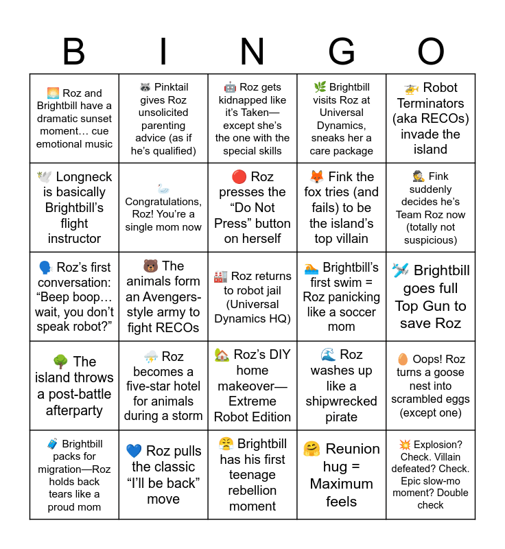 This bingo card has 25 words: ⛈️ Roz becomes a five-star hotel for animals during a storm, 😤 Brightbill has his first teenage rebellion moment, 🔴 Roz presses the “Do Not Press” button on herself, 🧳 Brightbill packs for migration—Roz holds back tears like a proud mom, 🚁 Robot Terminators (aka RECOs) invade the island, 🌅 Roz and Brightbill have a dramatic sunset moment… cue emotional music, 🕊️ Longneck is basically Brightbill’s flight instructor, 🦝 Pinktail gives Roz unsolicited parenting advice (as if he’s qualified), 🏊 Brightbill’s first swim = Roz panicking like a soccer mom, 🏡 Roz’s DIY home makeover—Extreme Robot Edition, 🦊 Fink the fox tries (and fails) to be the island’s top villain, 🗣️ Roz’s first conversation: “Beep boop… wait, you don’t speak robot?”, 🌊 Roz washes up like a shipwrecked pirate, 🥚 Oops! Roz turns a goose nest into scrambled eggs (except one), 🦢 Congratulations, Roz! You’re a single mom now, 💥 Explosion? Check. Villain defeated? Check. Epic slow-mo moment? Double check, 🛩️ Brightbill goes full Top Gun to save Roz, 🤖 Roz gets kidnapped like it’s Taken—except she’s the one with the special skills, 🕵️ Fink suddenly decides he’s Team Roz now (totally not suspicious), 🐻 The animals form an Avengers-style army to fight RECOs, 🏭 Roz returns to robot jail (Universal Dynamics HQ), 💙 Roz pulls the classic “I’ll be back” move, 🌳 The island throws a post-battle afterparty, 🌿 Brightbill visits Roz at Universal Dynamics, sneaks her a care package and 🤗 Reunion hug = Maximum feels.