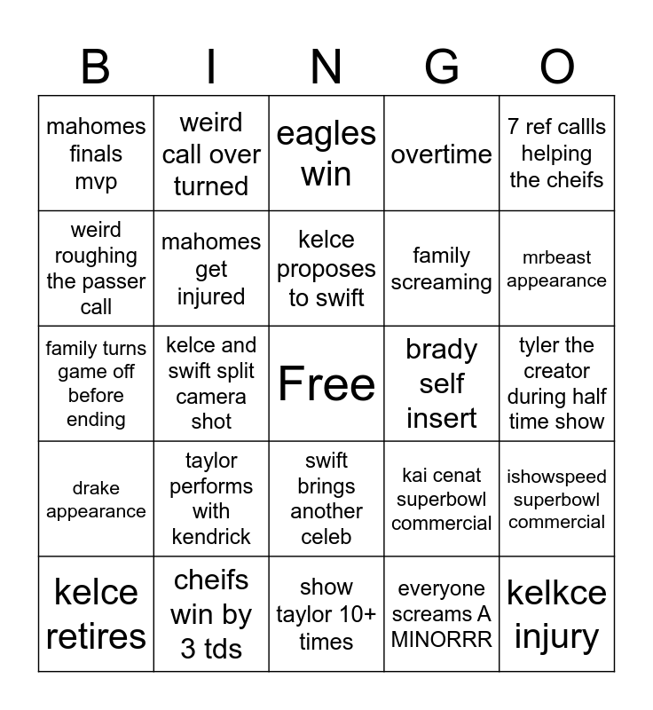 This bingo card has a free space and 24 words: taylor performs with kendrick, cheifs win by 3 tds, kelce proposes to swift, kelce retires, 7 ref callls helping the cheifs, mahomes finals mvp, weird roughing the passer call, weird call over turned, brady self insert, swift brings another celeb, family screaming, family turns game off before ending, kai cenat superbowl commercial, ishowspeed superbowl commercial, mahomes get injured, everyone screams A MINORRR, tyler the creator during half time show, eagles win, mrbeast appearance, kelce and swift split camera shot, kelkce injury, drake appearance, overtime and show taylor 10+ times.