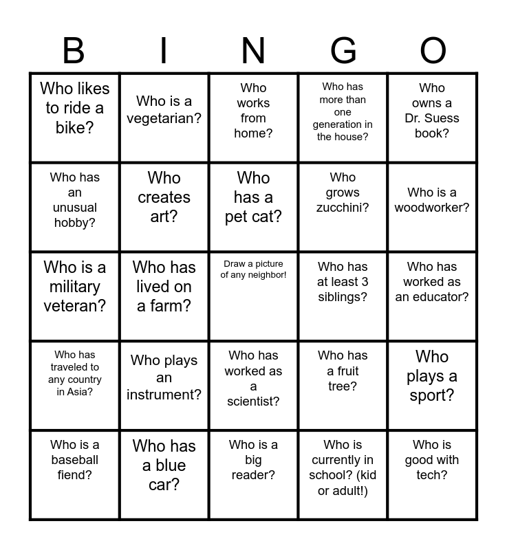 This bingo card has a free space and 24 words: Who plays an instrument?, Who has a blue car?, Who has a pet cat?, Who is a baseball fiend?, Who owns a Dr. Suess book?, Who likes to ride a bike?, Who has an unusual hobby?, Who is a vegetarian?, Who has at least 3 siblings?, Who has worked as a scientist?, Who grows zucchini?, Who is a military veteran?, Who has a fruit tree?, Who plays a sport?, Who creates art?, Who is currently in school? (kid or adult!), Who has worked as an educator?, Who works from home?, Who is a woodworker?, Who has lived on a farm?, Who is good with tech?, Who has traveled to any country in Asia?, Who has more than one generation in the house? and Who is a big reader?.