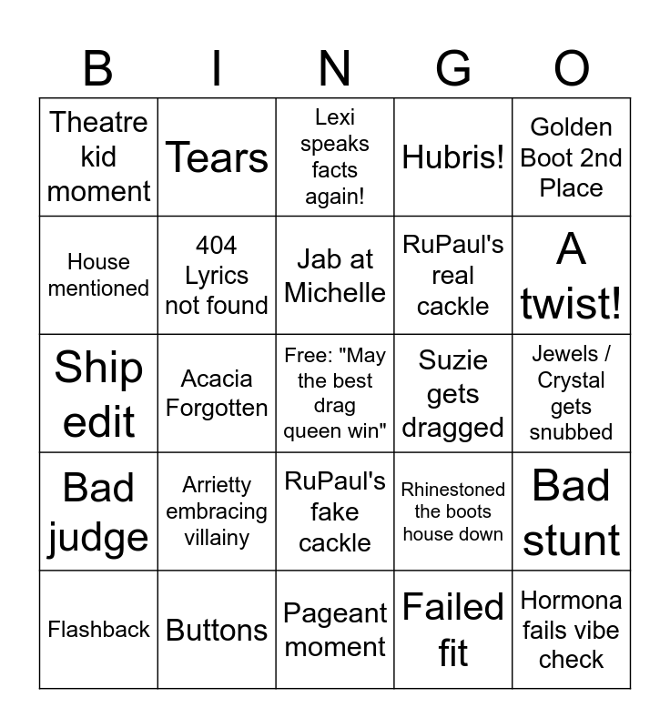 This bingo card has a free space and 24 words: Arrietty embracing villainy, Buttons, Jab at Michelle, Flashback, Golden Boot 2nd Place, Theatre kid moment, House mentioned, Tears, Suzie gets dragged, RuPaul's fake cackle, RuPaul's real cackle, Ship edit, Rhinestoned the boots house down, Bad stunt, 404 Lyrics not found, Failed fit, Jewels / Crystal gets snubbed, Lexi speaks facts again!, A twist!, Acacia Forgotten, Hormona fails vibe check, Bad judge, Hubris! and Pageant moment.