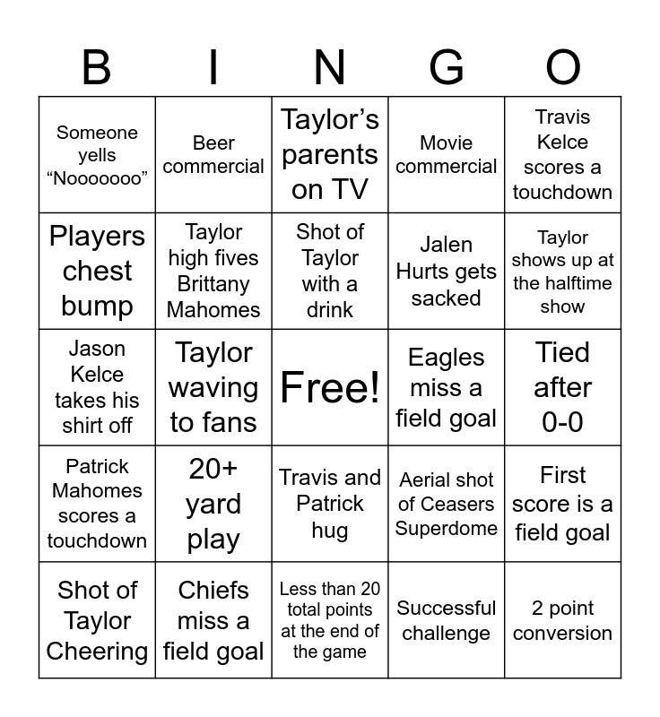 This bingo card has a free space and 29 words: Shot of Taylor Cheering, Mama Kelce on TV, Taylor waving to fans, Announcers mention Taylor Swift, Someone yells “Nooooooo”, Taylor’s parents on TV, Taylor high fives Brittany Mahomes, 20+ yard play, Eagles miss a field goal, Chiefs miss a field goal, Tied after 0-0, 2 point conversion, Less than 20 total points at the end of the game, Successful challenge, Taylor shows up at the halftime show, Someone complains about Taylor, Travis and Patrick hug, Patrick Mahomes scores a touchdown, Travis Kelce scores a touchdown, Jason Kelce takes his shirt off, Aerial shot of Ceasers Superdome, Jalen Hurts scores a touchdown, Jalen Hurts gets sacked, Players chest bump, Movie commercial, Beer commercial, First score is a field goal, Shot of Taylor with a drink and Celebrity sighting other than Taylor.