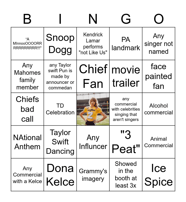 This bingo card has a free space and 24 words: Taylor Swift Dancing, Dona Kelce, Chief Fan, Any Commercial with a Kelce, Any singer not named, “A MInnooOOOORR RRRRRRRRR!!!", Any Mahomes family member, Snoop Dogg, any commercial with celebrities singing that aren't singers, Any Influncer, movie trailer, Chiefs bad call, "3 Peat", Animal Commercial, any Taylor swift Pun is made by announcer or commedan, Showed in the booth at least 3x, Alcohol commercial, Kendrick Lamar performs "not Like Us", face painted fan, TD Celebration, Ice Spice, NAtional Anthem, PA landmark and Grammy's imagery.