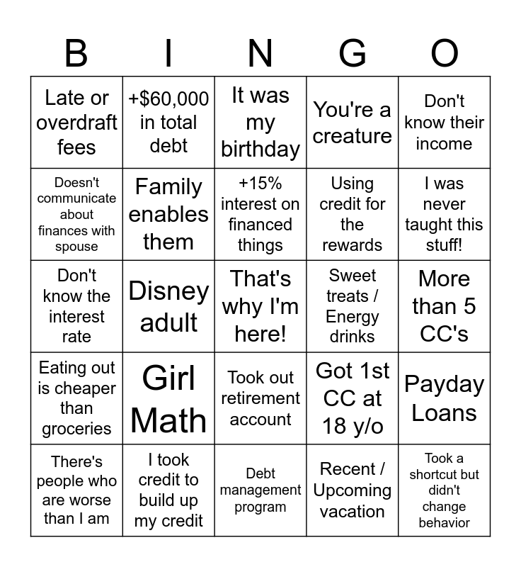 This bingo card has a free space and 24 words: Girl Math, I took credit to build up my credit, +15% interest on financed things, There's people who are worse than I am, Don't know their income, Late or overdraft fees, Doesn't communicate about finances with spouse, +$60,000 in total debt, Sweet treats / Energy drinks, Took out retirement account, Using credit for the rewards, Don't know the interest rate, Got 1st CC at 18 y/o, Payday Loans, Family enables them, Recent / Upcoming vacation, More than 5 CC's, It was my birthday, I was never taught this stuff!, Disney adult, Took a shortcut but didn't change behavior, Eating out is cheaper than groceries, You're a creature and Debt management program.