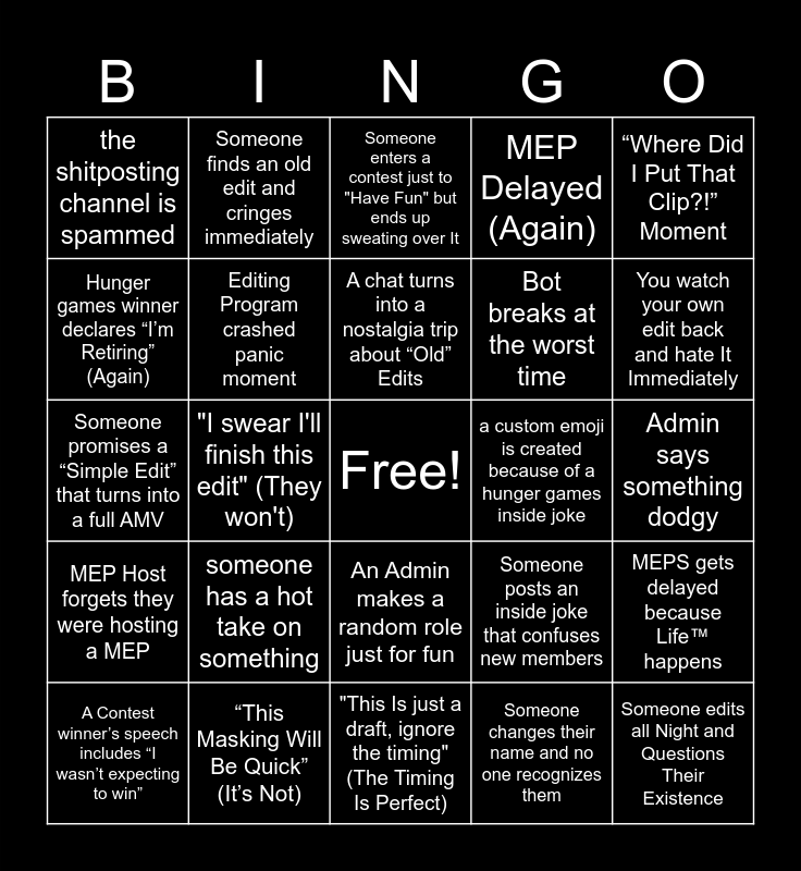 This bingo card has a free space and 24 words: someone has a hot take on something, “This Masking Will Be Quick” (It’s Not), A chat turns into a nostalgia trip about “Old” Edits, A Contest winner’s speech includes “I wasn’t expecting to win”, “Where Did I Put That Clip?!” Moment, the shitposting channel is spammed, Hunger games winner declares “I’m Retiring” (Again), Someone finds an old edit and cringes immediately, a custom emoji is created because of a hunger games inside joke, An Admin makes a random role just for fun, Bot breaks at the worst time, Someone promises a “Simple Edit” that turns into a full AMV, Someone posts an inside joke that confuses new members, MEPS gets delayed because Life™ happens, Editing Program crashed panic moment, Someone changes their name and no one recognizes them, Admin says something dodgy, Someone enters a contest just to "Have Fun" but ends up sweating over It, You watch your own edit back and hate It Immediately, "I swear I'll finish this edit" (They won't), Someone edits all Night and Questions Their Existence, MEP Host forgets they were hosting a MEP, MEP Delayed (Again) and "This Is just a draft, ignore the timing" (The Timing Is Perfect).