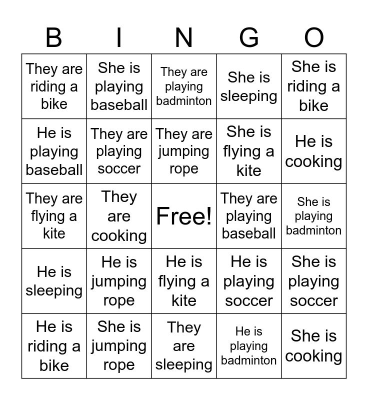 This bingo card has a free space and 24 words: He is jumping rope, She is jumping rope, They are jumping rope, He is riding a bike, She is riding a bike, They are riding a bike, He is playing baseball, She is playing baseball, They are playing baseball, He is flying a kite, She is flying a kite, They are flying a kite, He is playing soccer, She is playing soccer, They are playing soccer, He is playing badminton, She is playing badminton, They are playing badminton, He is cooking, They are cooking, She is cooking, He is sleeping, She is sleeping and They are sleeping.