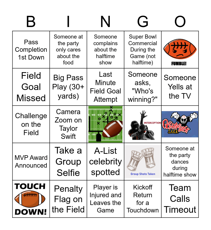 This bingo card has 5 images, a free space and 24 words: Field Goal Made, Camera Zoom on Taylor Swift, Someone asks, "Who's Performing again?", Pass Completion 1st Down, Someone complains about the halftime show, Big Pass Play (30+ yards), Take a Group Selfie, Penalty Flag on the Field, Team Calls Timeout, Player is Injured and Leaves the Game, Kickoff Return for a Touchdown, Someone Yells at the TV, Kendrick Lamar sings a song you know, A-List celebrity spotted, MVP Award Announced, Challenge on the Field, Touchdown Celebration Dance, Someone asks, "Who's winning?", Field Goal Missed, Super Bowl Commercial During the Game (not halftime), Someone at the party only cares about the food, Someone at the party dances during halftime show, Last Minute Field Goal Attempt and Someone Swears.