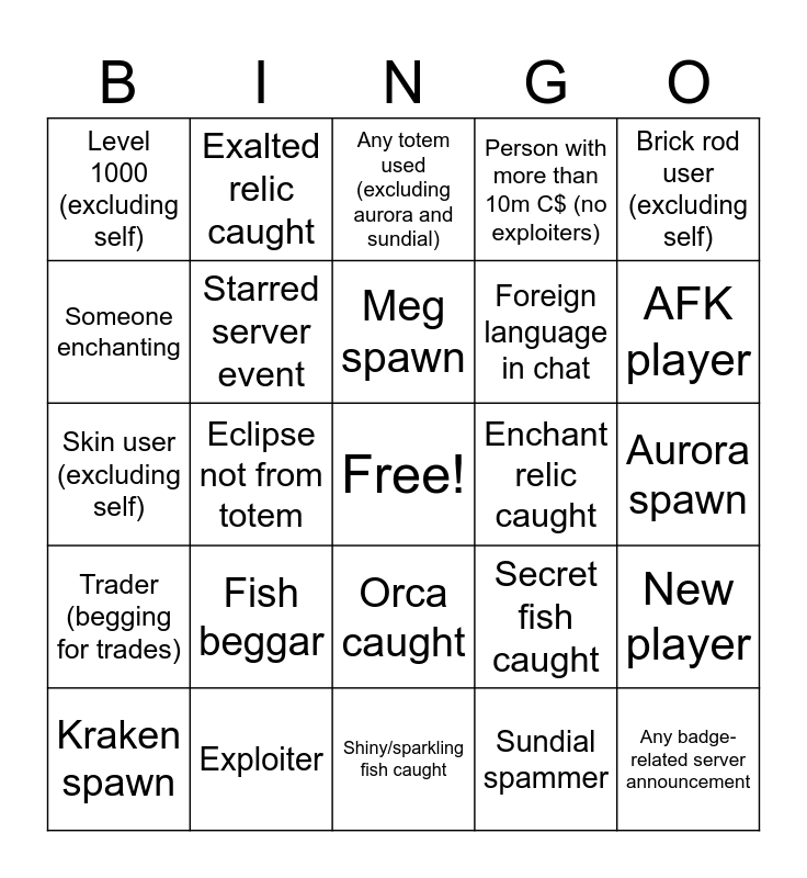 This bingo card has a free space and 24 words: Fish beggar, Exploiter, Meg spawn, Kraken spawn, Brick rod user (excluding self), Level 1000 (excluding self), Someone enchanting, Exalted relic caught, Enchant relic caught, Orca caught, Foreign language in chat, Skin user (excluding self), Secret fish caught, New player, Starred server event, Sundial spammer, Aurora spawn, Any totem used (excluding aurora and sundial), AFK player, Eclipse not from totem, Any badge-related server announcement, Trader (begging for trades), Person with more than 10m C$ (no exploiters) and Shiny/sparkling fish caught.
